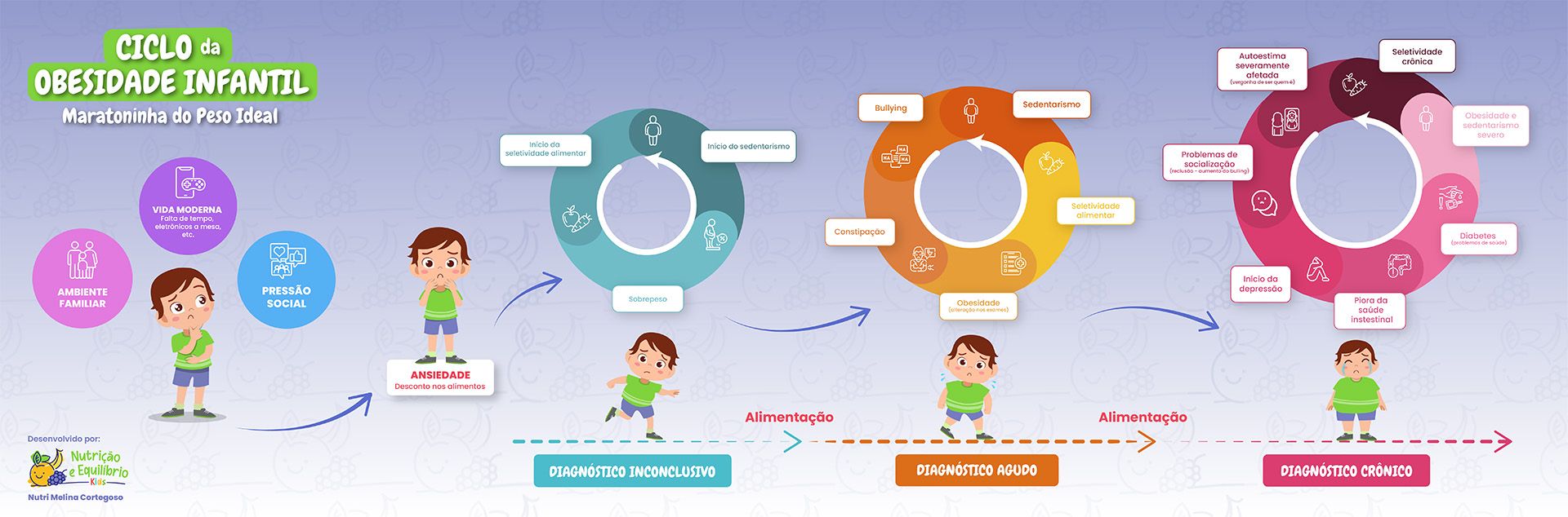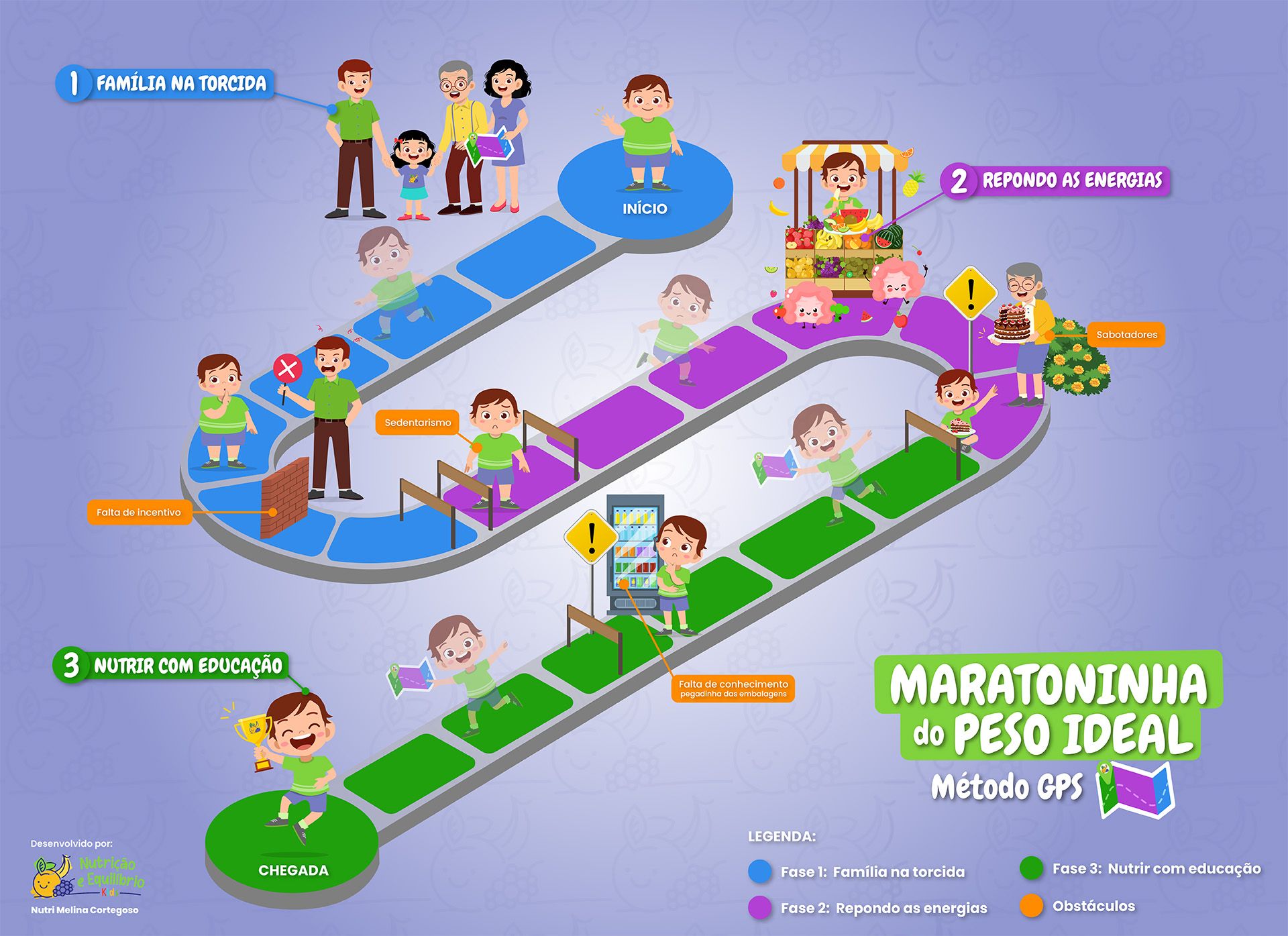 De forma educativa, o projeto visual foi criado para que a criança participe dessa jornada junto com a mãe, utilizando cores e ilustrações de maneira divertida, como um tabuleiro de jogo. O infográfico do Ciclo da Obesidade Infantil complementa as informações essenciais do programa.