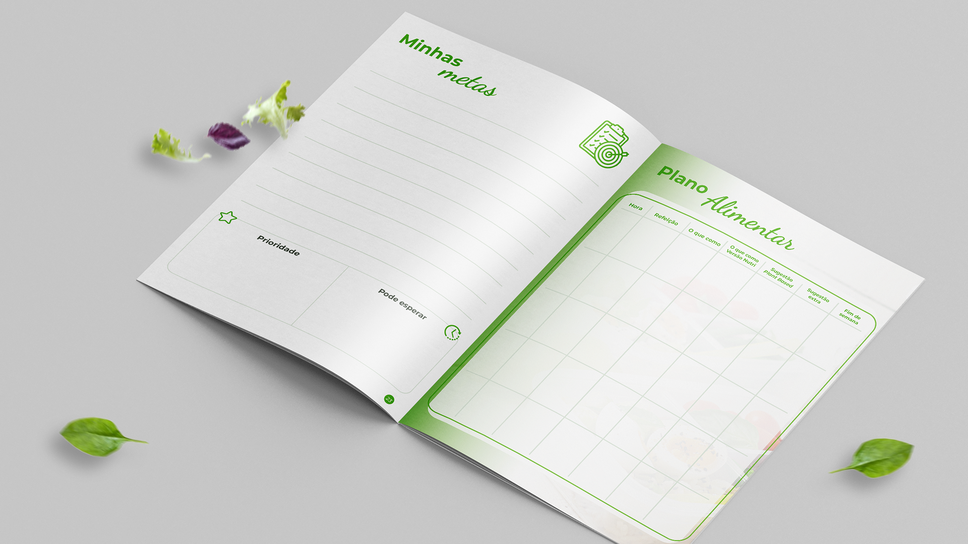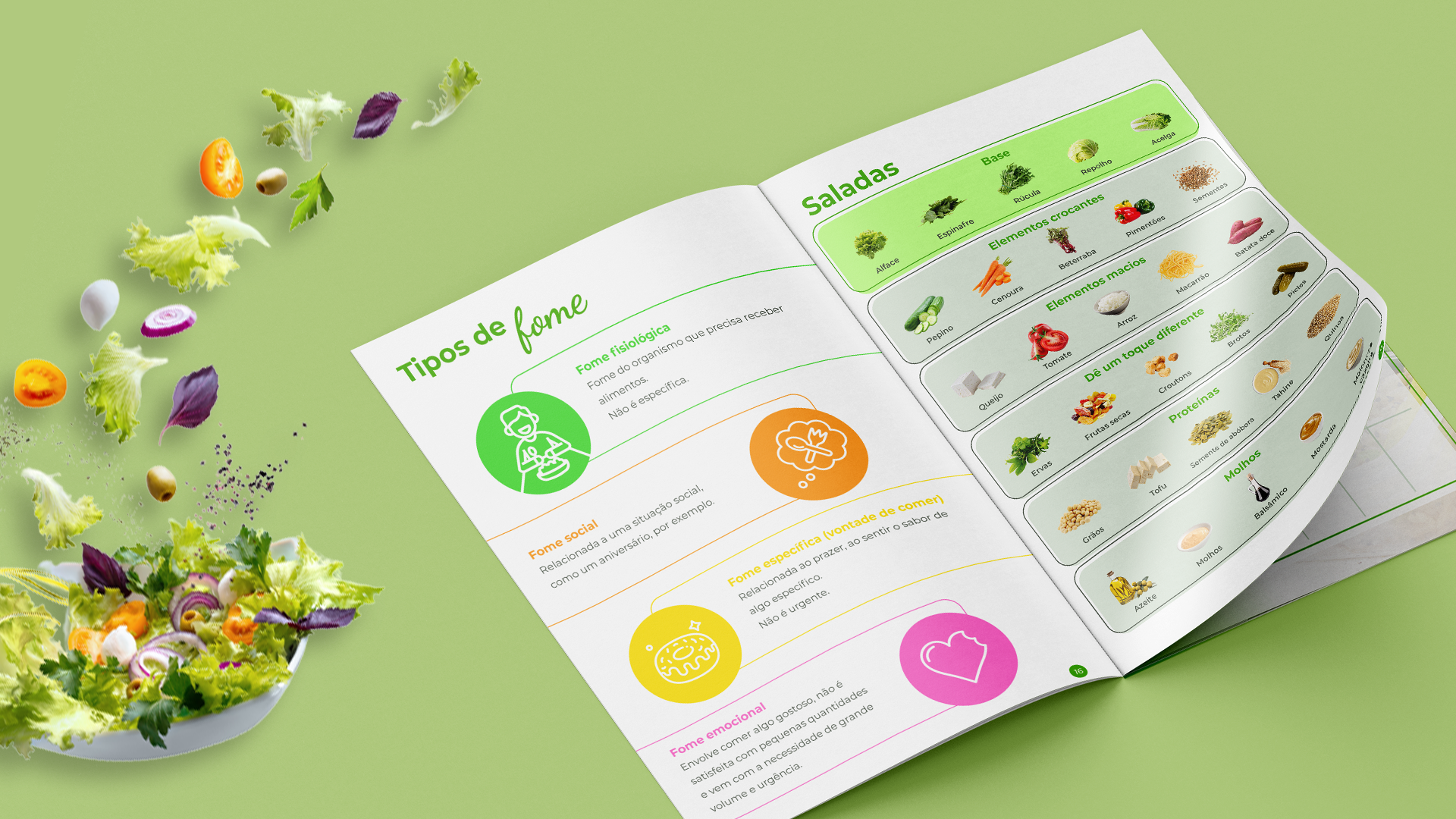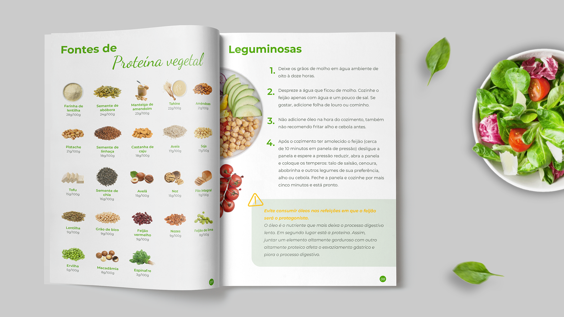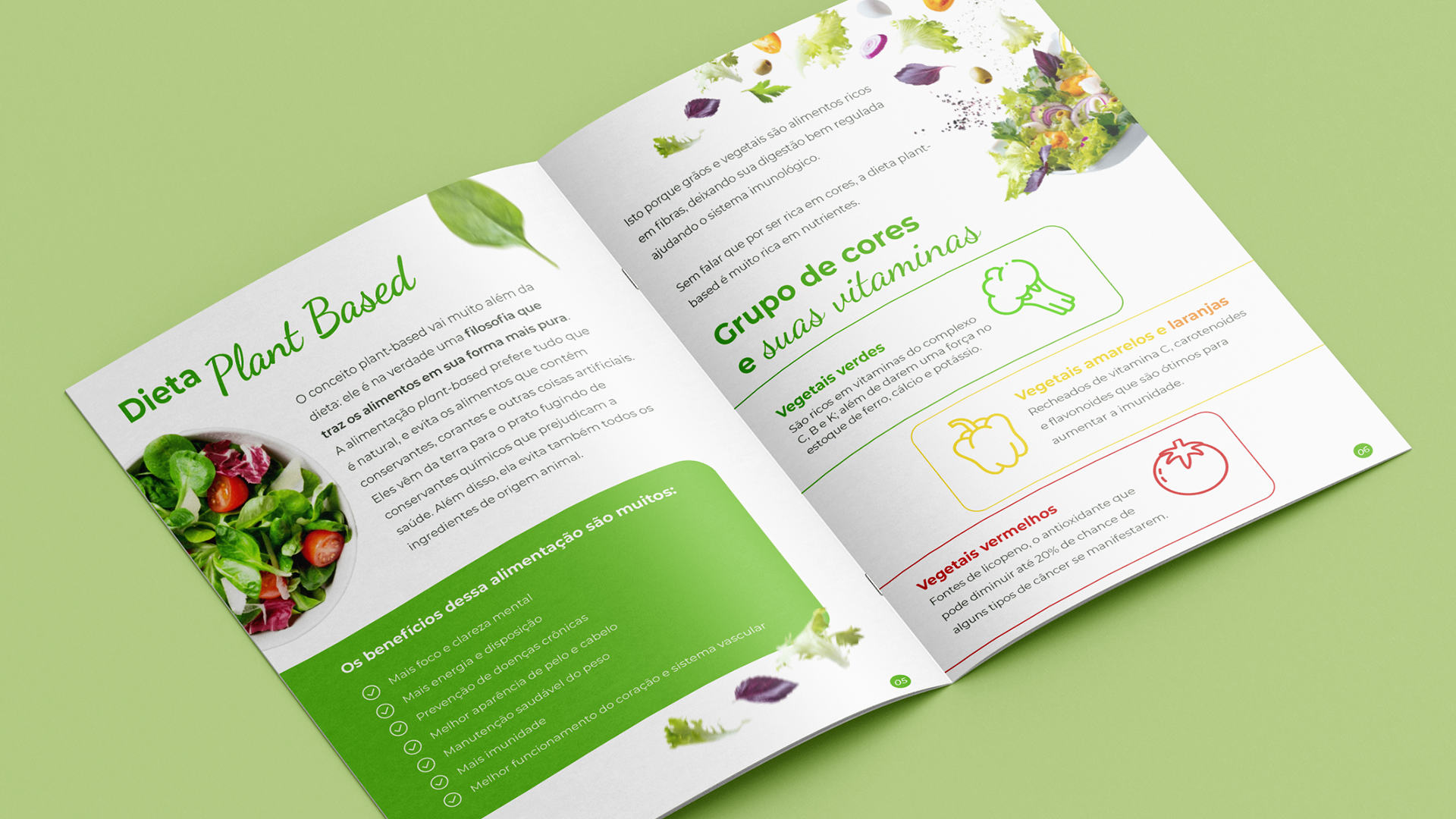 A concepção do guia envolveu uma cuidadosa estruturação das seções, com ênfase na clareza e uma identidade visual ilustrativa e colorida, facilitando a leitura e a aplicação prática do conteúdo no dia a dia do paciente. A seleção da tipografia e das cores principais foi feita para transmitir uma sensação de frescor e vitalidade, alinhada com a ideologia da alimentação baseada em plantas.